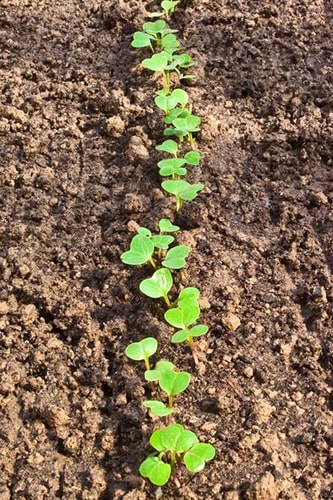 После того как влага ушла, в бороздки по одному раскладывают семена, оставляя между ними промежутки около 5 см (когда сеянцы пойдут в рост необходимо будет их проредить так, чтобы промежутки между растениями в итоге оказались 15-20 см). Если не хочется прореживать, то можно сразу раскладывать через 15-20 см (но тогда есть риск, что что-то может не взойти).