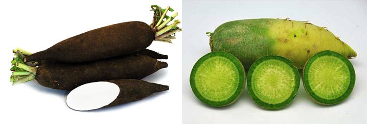 - Внешний вид – самое очевидное различие. Цвет черной редьки варьируется от бурого до черного, а зеленой – от бледно до ярко-зеленого оттенка.