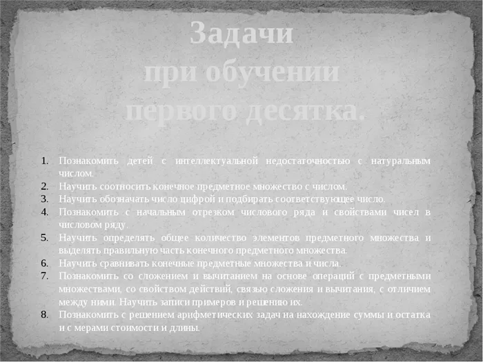 Цели преподавания первых десяти. Владение умственно отсталыми детьми физическими цифрами. Узнайте, как соотносить конечные множества объектов с числами. Научить нумеровать и присваивать номера числам. Введите первую часть последовательности чисел и свойства нумерации последовательности чисел. Учит определять общее количество элементов в наборе чисел и определять правильную часть конечного набора чисел. Учит сравнивать конечное множество элементов и конечное множество чисел. Знакомит со сложением и вычитанием на основе операций предметного множества, свойств действий, взаимосвязи между сложением и вычитанием и различий между ними. Учит составлять и решать примеры. Обзор сумм и остатков и использование мер стоимости и длины для решения числовых задач.