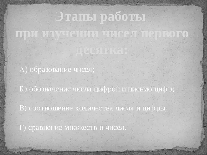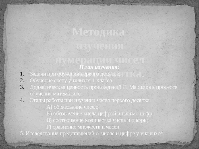 Методика обучения нумерации первых десяти чисел. План исследования: задания для преподавания первых десяти. Преподавание математики студентам первого курса. Дидактическое значение работ С. Маршака для преподавания математики. Этапы работы при изучении первых десяти чисел: a) образование чисел — b) называние и запись чисел — c) соотнесение чисел и цифр — d) сравнение множеств и чисел. 5.Исследовать понимание учащимися чисел и цифр.