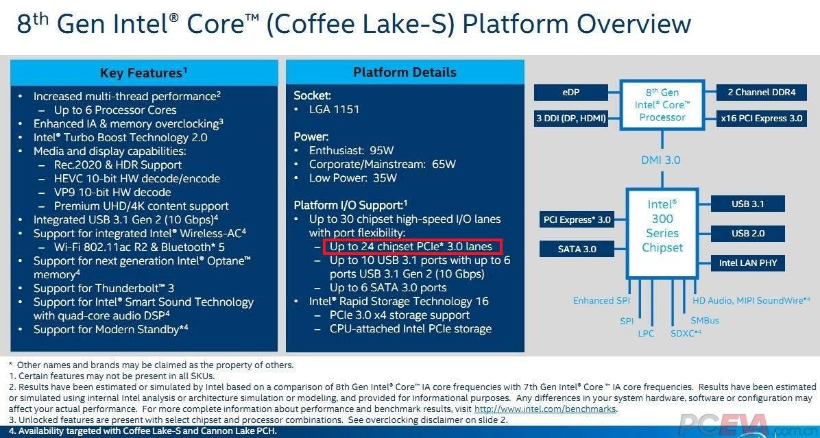 Компания Intel готовится выпустить первые модели Core i7 и Core i5 Coffee Lake, а также материнские платы на базе чипсета Intel Z370 Express уже в конце этого года. Оказалось, что новый чипсет получит 24 линии PCI -Express gen 3.0. И это не считая 16 линий, предназначенных процессором для слотов PEG (PCI -Express Graphics).
