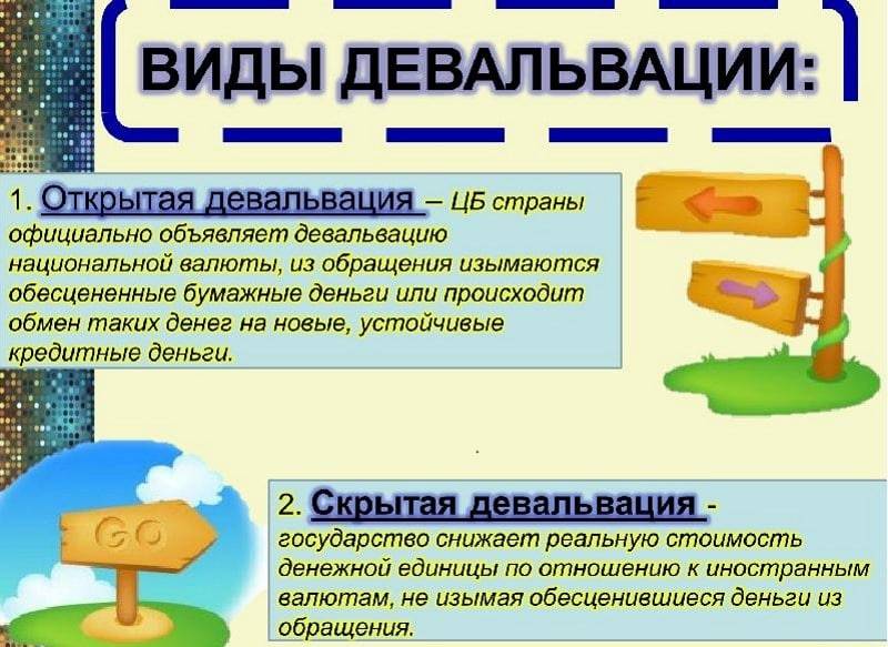 – Девальвация – это снижение курса валюты одной страны в отношении к валютам других государств. Если просто: то девальвация это процесс, при котором стоимость (ценность) денег в экономике падает, другими словами кол-во денег на руках у населения остаётся прежним, а кол-во того, что на них можно приобрести – уменьшается.