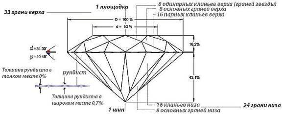 Если рассматривать классическую огранку драгоценного камня, то мастер наносит до 57 граней, делая алмаз круглым. Данную методику можно применять ко всем экземплярам, которые составляют 0,3 карат и больше. На маленьких камнях должны быть около 17 граней, на больших – 74, 86 либо 102. Для классификации круглой огранки предусмотрено несколько групп – А, В. Первая показывает соотношение формы минерала к граням, вторая – имеющиеся изъяны, нарушение симметрий.