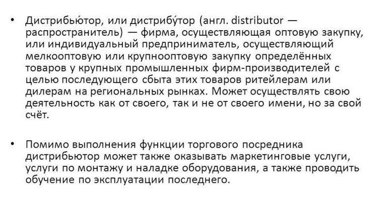Дистрибьютер является официальным лицом и представляет на определенном сегменте рынка компанию – производителя. Иными словами можно сказать, что он является связующим звеном среди производителей и розничных продавцов.