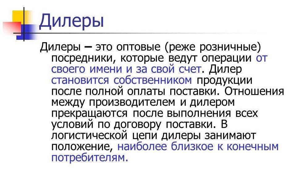 Если перевести термин «дилер» с английского языка, то оно означает слово «агент». В этой роли может выступать как физическое лицо, так и крупное юридическое лицо. В отношениях «производитель и покупатель», где есть масса промежуточных звеньев, именно на этого участника торгового процесса приходится финальное звено перед конечным потребителем.