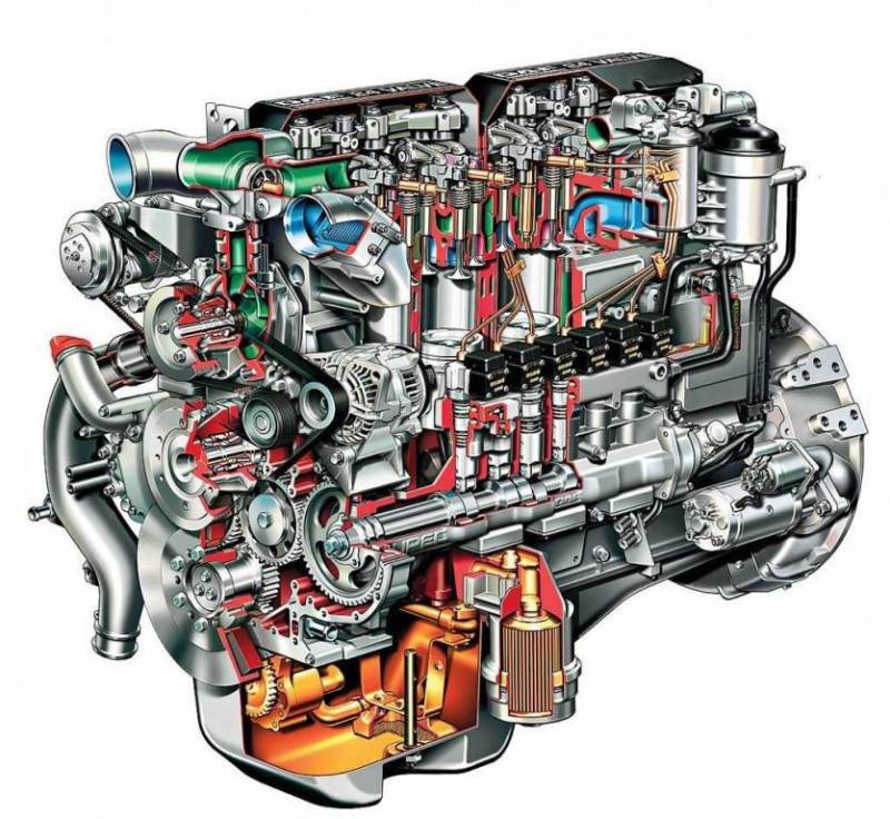 Дизельный двигатель. Образование топливовоздушной смеси в дизельной установке происходит значительно быстрее. В цилиндре дизельного ДВС сжимается только воздух, который нагревается при этом до 900°С. Топливо подается в камеру отдельно. Мелкие капли солярки быстро испаряются и смешиваются с воздухом. Благодаря более высокой температуре, такая смесь самовоспламеняется и не нуждается в дополнительной искре.