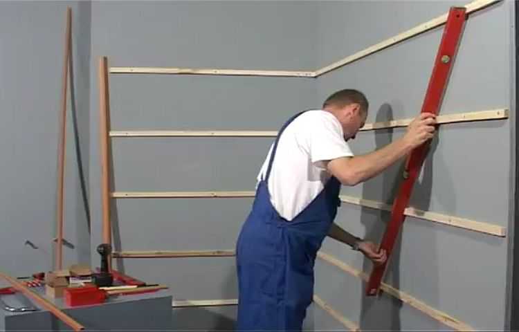 Если поверхность стен или потолка неровная (отклонения больше 1 см), способ монтажа листового МДФ такой же как и у гипсокартона — на каркас. Каркас обычно собирают из деревянных брусков, но никто не запрещает ставить профили под гипсокартон. Сечение брусков подбирают исходя из неровностей стены — они должны компенсировать все перепад высоты. Скорее всего, вам понадобятся бруски 20*30 мм или что-то около того. Их набивают горизонтально с шагом 40 см. При таком шаге стыки листов (они есть, если высота потолка выше чем 280 см) приходятся на планку.
