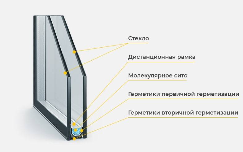 Это пакет с двумя стеклами, между которыми располагается воздушное пространство – камера. Сами стекла разделяются своеобразной перегородкой – дистанционной рамкой (спейсером), которая делается из алюминия или пластика. Она имеет перфорацию, внутри располагается абсорбент – гранулы силикагеля, впитывающие лишнюю влажность и защищающую окно от запотевания. Наполнение камеры может быть как осушенным воздухом, так и инертным газом (чаще всего аргоном). Камера полностью герметична.
