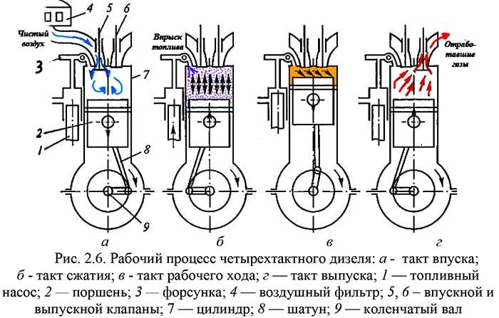 Рабочий цикл четырехтактного двигателя на дизельных силовых агрегатах немного отличается от такового на бензине. Камеры сгорания содержат кислород, который нагревается до температуры, достаточной для воспламенения топлива. Прежде чем поршень достигнет верхней мертвой точки, в цилиндр впрыскивается жидкое дизельное топливо, которое форсунки разбрызгивают небольшими каплями для более быстрой реакции с нагретым воздухом.