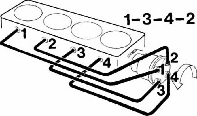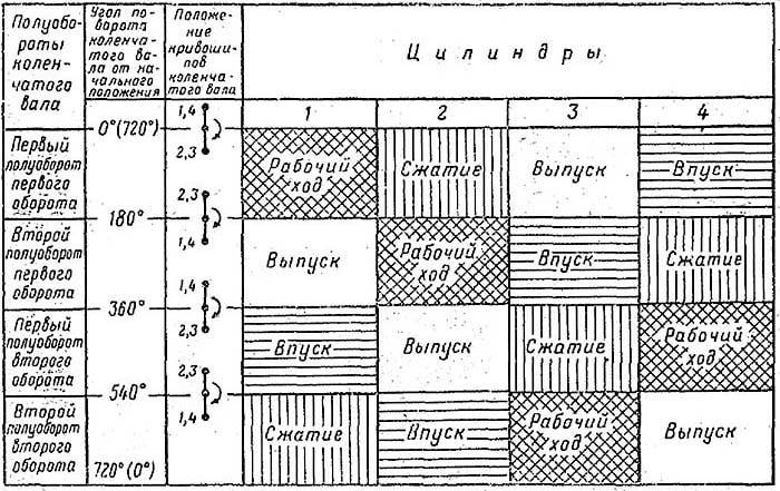 Чтобы многоцилиндровый двигатель работал плавно, ходы различных цилиндров должны чередоваться в определенной последовательности и через равные промежутки времени. Примерный порядок работы четырехцилиндрового двигателя внутреннего сгорания: