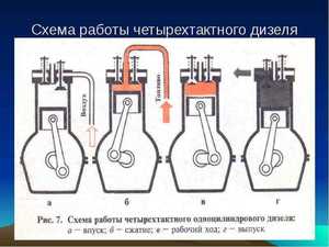 Рабочий цикл четырехтактного двигателя на дизельных силовых агрегатах немного отличается от такового на бензине. Камеры сгорания содержат кислород, который нагревается до температуры, достаточной для воспламенения топлива. Прежде чем поршень достигнет верхней мертвой точки, в цилиндр впрыскивается жидкое дизельное топливо, которое форсунки разбрызгивают небольшими каплями для более быстрой реакции с нагретым воздухом.