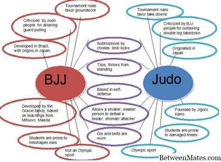 Дзюдо против Джуджицу Прежде всего отличительной чертой является тот факт, что джиу-джитсу является прародителем дзюдо. Jujitsu – это полная система боевых действий, развернутая древними японскими самурайскими воинами, и включает в себя использование ударов, ударов ногами, схваток, мечом и то, что вы должны уничтожить противника. Дзюдо – это всего лишь один и