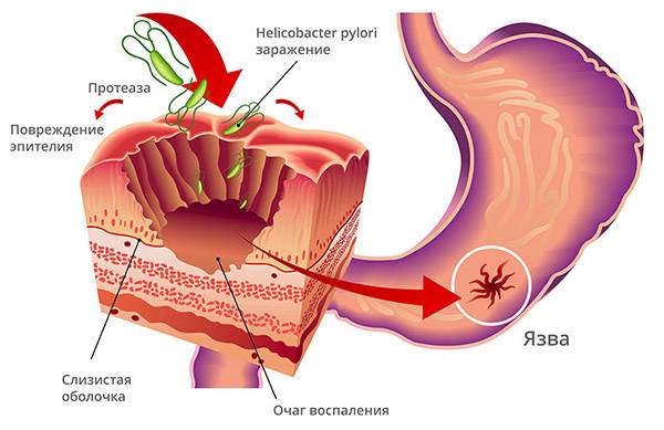 - колонизация слизистой желудка бактерией хеликобактер пилори — это самая распространенная причина язвенной болезни;