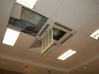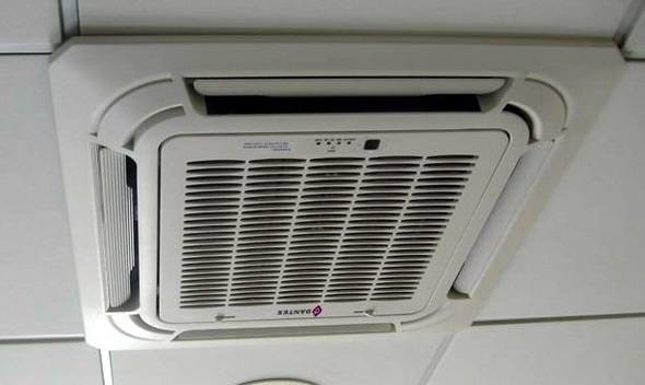 Кассетный агрегат встраивается в подвесной потолок, подобные виды фанкойлов, отвечающие всем нормативам и стандартам, применяются в помещениях с большой площадью – в офисах, гостиницах, кафе, ресторанах, административных учреждениях. Кассетный фанкойл относится к бескорпусным и предназначен для скрытой установки, он размещается за потолочными плитами, видна только фронтальная декоративная панель с регулируемыми жалюзи, распределяющими потоки воздуха.