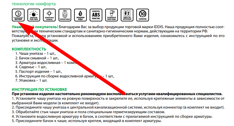 Поэтому единственный способ отличить унитаз из фаянса от аналога из фарфора — прочитать документацию на изделие. В техпаспорте этот параметр указывается в обязательном порядке.
