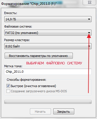 в появившемся окне выбираем тип файловой системы, с помощью которой вы бы хотели отформатировать носитель (о параметрах выбора мы говорили выше);