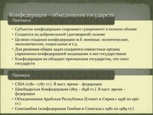 Таким образом, конфедерация – это достаточно сложное политическое и территориальное формирование, которому присущи характерные признаки.