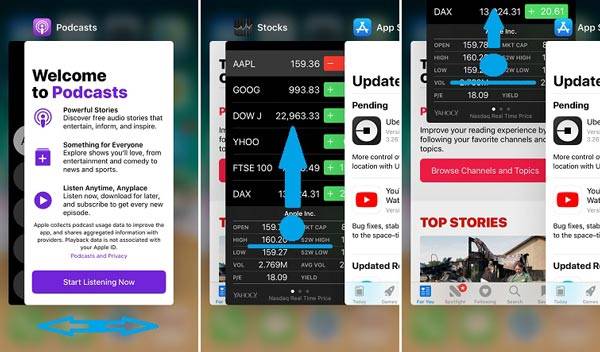 На iPhone X / 8 / 8 Plus / 7 / 7 Plus переключайтесь вверх от нижней части экрана к середине и удерживайте, пока не откроется переключатель приложений. Проведите пальцем влево и вправо, чтобы найти приложение «Камера», а затем проведите вверх, чтобы полностью выйти из него.