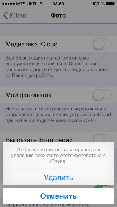 Шаг 5. Подтвердите отключение функции и удаление всех фото этого фотопотока, нажав кнопку «Удалить