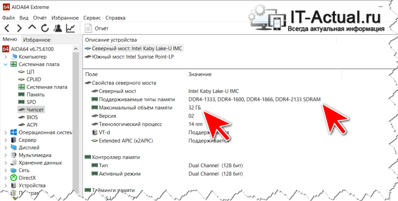 Довольно популярная утилита под названием AIDA64 справляется с задачей выяснения аппаратной составляющей стационарного компьютера или ноутбука просто филигранно. И для выяснения поддерживаемого типа оперативной памяти всего лишь следует открыть оную и перейти в соответствующий раздел, а именно Системная плата -> Чипсет -> Свойства северного моста. И там будет два ключевых пункта, которые нас интересуют.