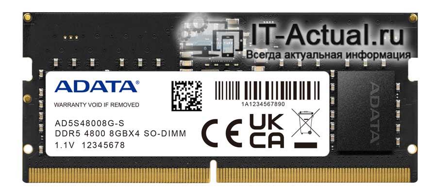 В случае, если места для ещё одной плашки нет, то ситуация всё равно может быть решена. Об этом будет рассказано ниже. А сейчас давайте перейдём к параметрам, информация о которых размещается на плашках оперативной памяти. Вот изображение DDR5 оперативной памяти для ноутбука.