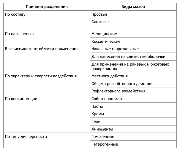 Выделяют такие разновидности мазей в зависимости от различных свойств: