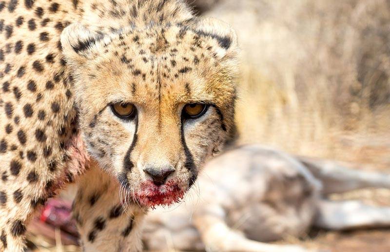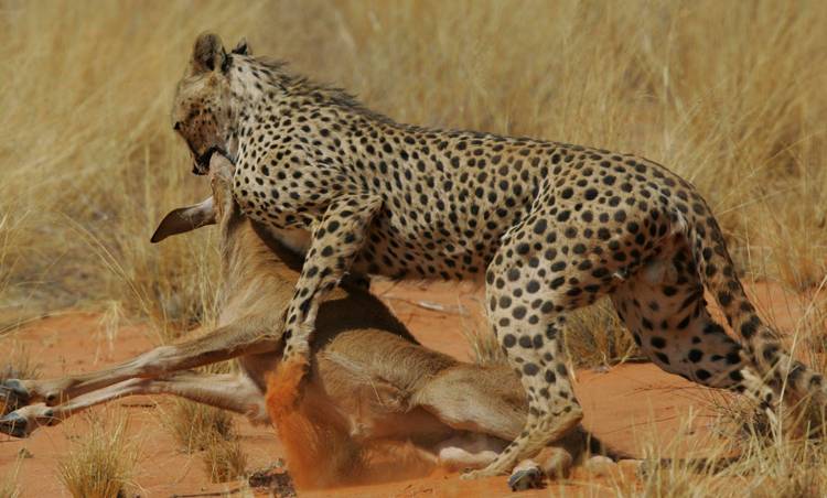 В отличие от леопарда, гепард охотится днем. Он устраивает короткие, но эффективные погони за газелями, телятами и даже зайцами. Пойманную добычу гепард не прячет и, тем более, не затаскивает на деревья.