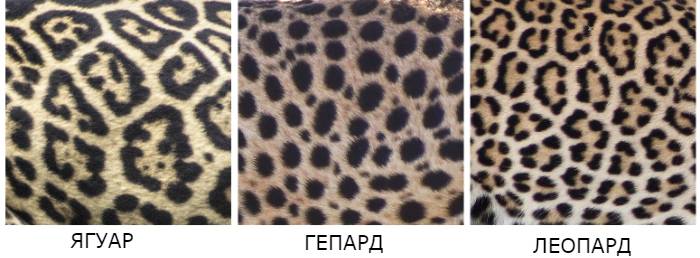 Окрас Леопардов – бледно-желтый с темными «розетками», центр которых не закрашен. Основной тон шерсти Ягуаров – насыщенный рыжий, узор на шкуре имеет вид «розеток» с точками внутри, образующих скопления. Шкура Гепардов – желто-песочного цвета с черными отметинами, имеющими вид кружков или эллипсов.