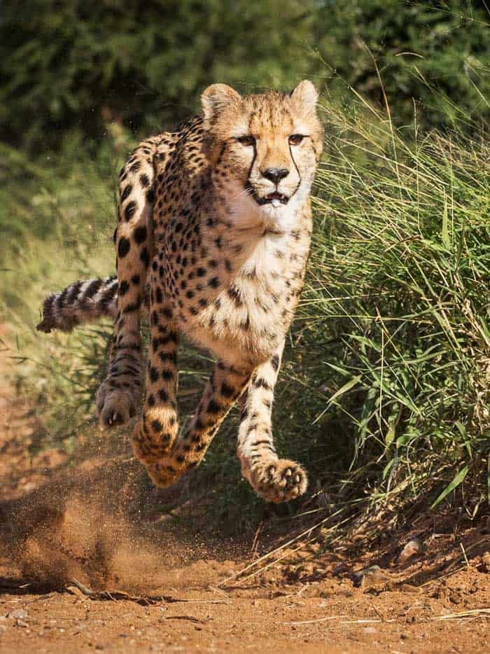 Уникальное строение тела дает возможность ему развивать исключительную скорость, достигая 115-130 км/ч. Не догнав добычу, быстро перестает ее преследовать. Двигается большими скачками: в длину — до 8 м, прыжок в высоту — до 4 м.