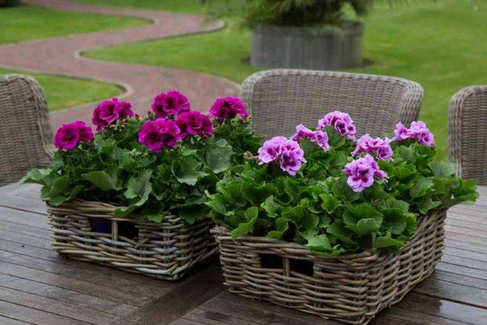 Пеларгония превосходно украшает садовый ландшафт. Цветки раскрываются во всей красе и переливаются разноцветьем. Пеларгонию высаживают в большие стационарные керамические вазоны, специальные корзины, ампельные виды подвешивают в кашпо. Можно посадить несколько экземпляров гераней разного цвета в один горшок и получить потрясающую картину, радующую глаз своим цветением до осени.