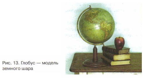 Посмотрите на глобус. Примерно то же самое видят космонавты, находящиеся на околоземной орбите. Гло́бус — модель земного шара. Он наиболее правильно отображает форму нашей планеты. На нём в очень уменьшенном виде изображены все имеющиеся на поверхности Земли крупные объекты: материки и океаны, острова и полуострова, моря и заливы (рис. 13). Всю поверхность Земли можно увидеть, повернув глобус всего лишь один раз. Глобус очень удобен для того, чтобы представить себе форму и облик поверхности нашей планеты, но в некоторых случаях, он не слишком-то годится. Глобус — предмет довольно громоздкий, он не складывается, и в карман его не положить. Его невозможно взять с собой в поход. Да и трудно представить, например, лётчика, который крутит перед собой в кабине глобус. Карта удобнее, да к тому же на ней отражено больше разной информации, чем на глобусе.