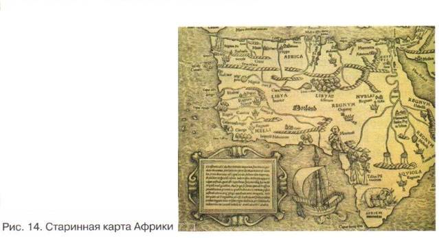 Первые карты представляли собой рисунки, изображавшие какую-либо местность, а иногда и целые страны (рис. 14). Давайте сравним изображения на рисунке и на географической карте, например на форзаце учебника. Мы увидим, что на старинной карте всё изображалось, как есть: город — это группа домиков, лес — группа деревьев и т.д. Но из-за того, что каждый видит мир по- своему, рисунки получались разные. В результате рисованными картами не очень удобно было пользоваться. Прошло немало веков, прежде чем люди придумали простые, понятные всем способы изображения разных объектов на карте. Карты перестали быть рисунками, а превратились в чертежи, понять которые может любой человек, который умеет читать карту. Ка́рта — это чертёж, изображающий поверхность Земли в уменьшенном виде.