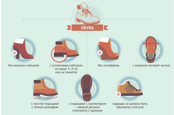 К обуви нужно предъявлять определённые требования. Во-первых, никаких высоких каблуков. Во-вторых, обязательная цепкость подошвы.