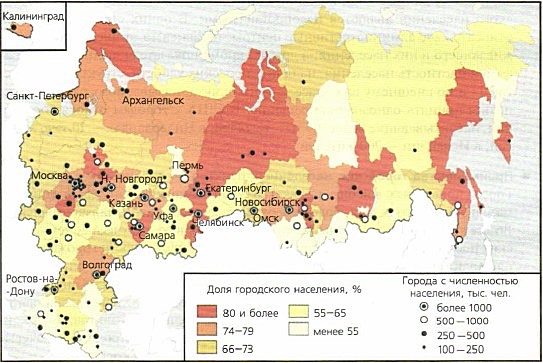 На 1 января 2009 г. в России насчитывалось 1099 городов и 1318 ПГТ (рис. 4). Общая численность городского населения составляла 108,2 млн человек, или 73% от общего числа граждан РФ.