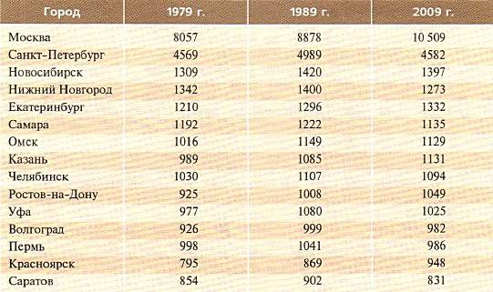 Таблица 1. Самые крупные по численности населения города РФ (1979-2009 гг.), тыс. чел
