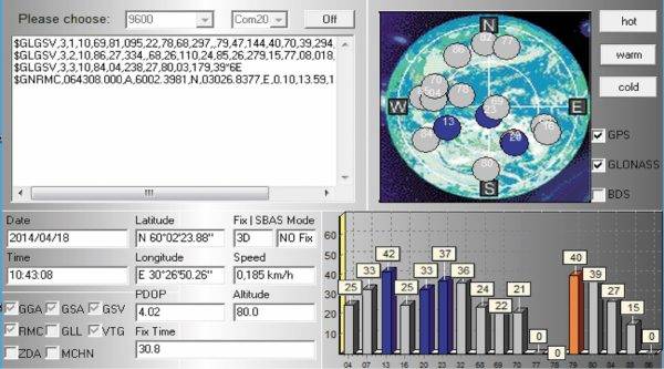 В результате холодный старт (при полном отсутствии какой-либо предварительной информации) составляет минимум 30 с, а в случае плохой обсервации, переотраженных сигналов, наличия помех и прочего это время намного увеличивается. Кроме того, каждый спутник передает собственные эфемериды (параметры отклонения от заданной орбиты), они необходимы для более точного вычисления координат. Полный цикл передачи эфемерид составляет около 12 мин., при этом процессор модуля также несет дополнительную нагрузку, что не может не отражаться на энергопотреблении. Все вышеуказанное приведено лишь для одной GNSS (в данном случае GPS), мультисистемные же модули производят аналогичные вычисления для каждой из используемых систем, что еще более усугубляет ситуацию с энергопотреблением. Так, двухсистемные модули при работе в совмещенном режиме при обнаружении потребляют примерно на 20–50% больше тока, чем при работе только с одной спутниковой группировкой. В качестве примера на рис. 3 показан типичный холодный старт модуля Telit SL869 V2. Характерно, что пространственное решение получено с использованием трех спутников GPS и одного ГЛОНАСС, что наглядно иллюстрирует преимущества мультисистемных приемников даже без использования A-GPS.