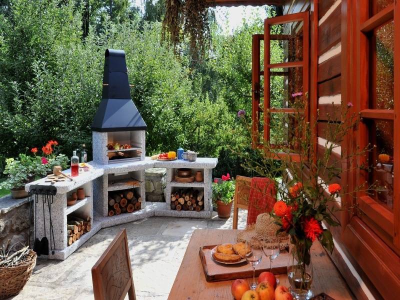 - В беседке, на открытой террасе частного особняка или на охраняемой даче лучшим выбором станет дровяной или угольный вариант. Массивная конструкция подойдет, если вы часто устраиваете посиделки и любите еду, приготовленную на открытом огне.