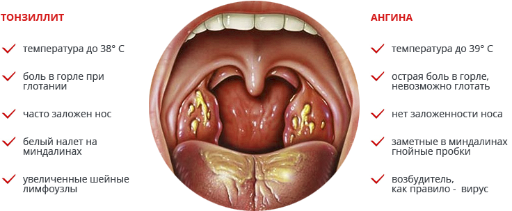 Симптоматика хронического тонзиллита похожа на ангину, но не сильно выражена. Появляется неприятный запах изо рта. Общее недомогание не всегда связано с повышением температуры тела. На миндалинах формируются казеозные пробки. Главным отличием является заложенность носа. Для ангины характерным является резкая боль в горле, ломота суставов. При тонзиллите такие проявления отсутствуют или выражены слабо. Часто пробки при нем носят творожистый характер.