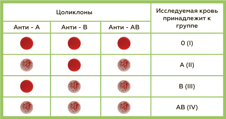 Для определения группы крови ее смешивают с реагентом, содержащим известные антитела. На основу наносят три капли крови человека: к первой капле добавляют реагент анти-А, к другой капле — реагент анти-В, к третьей – реагент анти-D. Первые две капли используются, чтобы определить группу крови, а третья — для выявления резус-фактора. Если эритроциты не склеились в ходе опыта, значит, группа крови человека совпадает с типом анти-реагента, который в нее добавили. Например, если в капле, куда добавили реагент анти-А, частички крови не слиплись, значит у человека группа крови А (II).