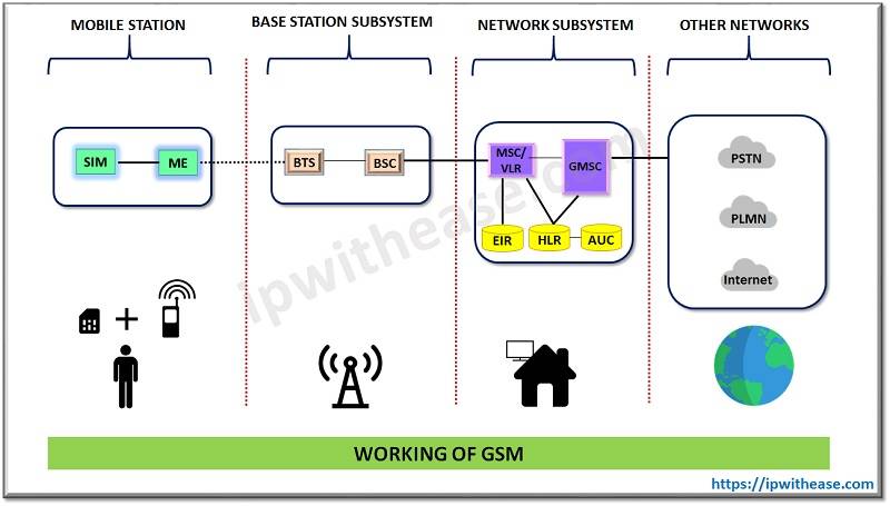 The main components of GSM system are – Network subsystem, Radio subsystem and Operation and maintenance subsystem.