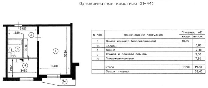 Р-44 — одна из самых популярных серий, особенно в Москве. То, что до сих пор популярно и большинство жителей совсем не готовы переезжать в новые «населенные пункты». Основной период строительства – с 1978 по 2000-е годы. На фото ниже вы можете увидеть планировку 1-комнатной квартиры.