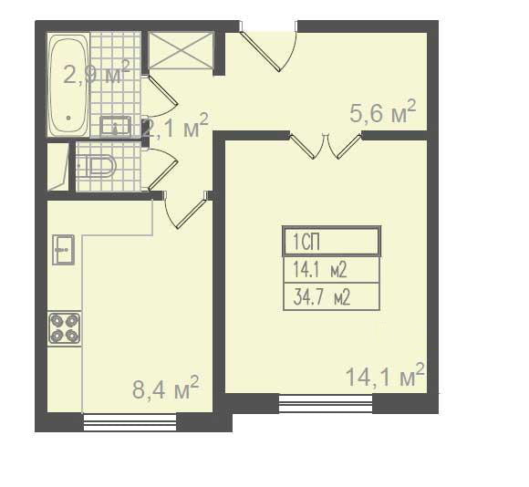 Площадь однушки небольшая — 34,7 кв.м. Для кухни отведено достаточно места, а размер гостиной небольшой – всего 14,1 кв. Также нет ни балкона, ни лоджии. Для некоторых эти функции являются недостатком.
