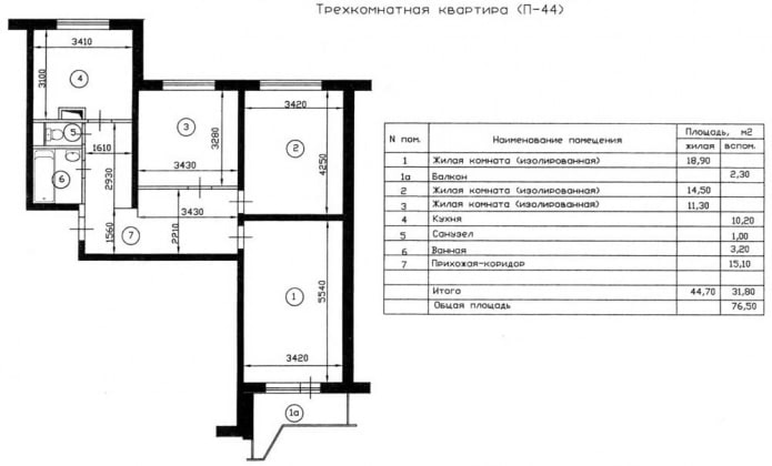 Трешка имеет общую площадь 76,5 кв. Отличительной чертой квартир этой серии являются изолированные комнаты. Туалет и ванная раздельные. Кухня большая, есть балкон. Из недостатков можно выделить маленькую спальню – всего 11 кв.