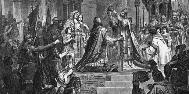 В 800 году Карл прибыл в Рим и был провозглашён императором; папа в храме возложил на его голову императорскую корону. Обряд коронования с участием высших священнослужителей с тех пор стал распространяться в Европе.