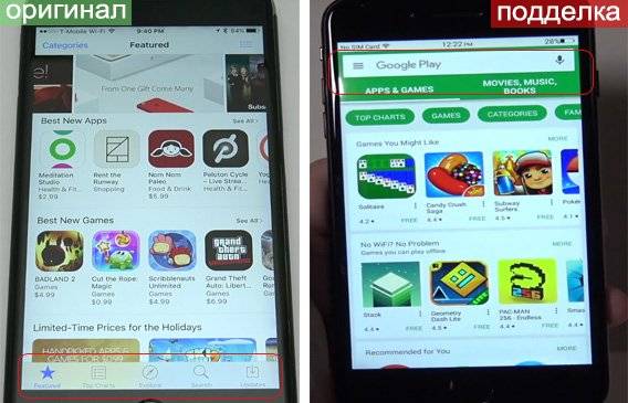 Пару роликов с Youtube, в которых делают визуальное сравнение оригинала с подделкой. Воочию убедитесь, какие китайцы «молодцы», как внешне и частично программно научились подделывать телефоны компании Apple. Запоминайте все мелкие нюансы.