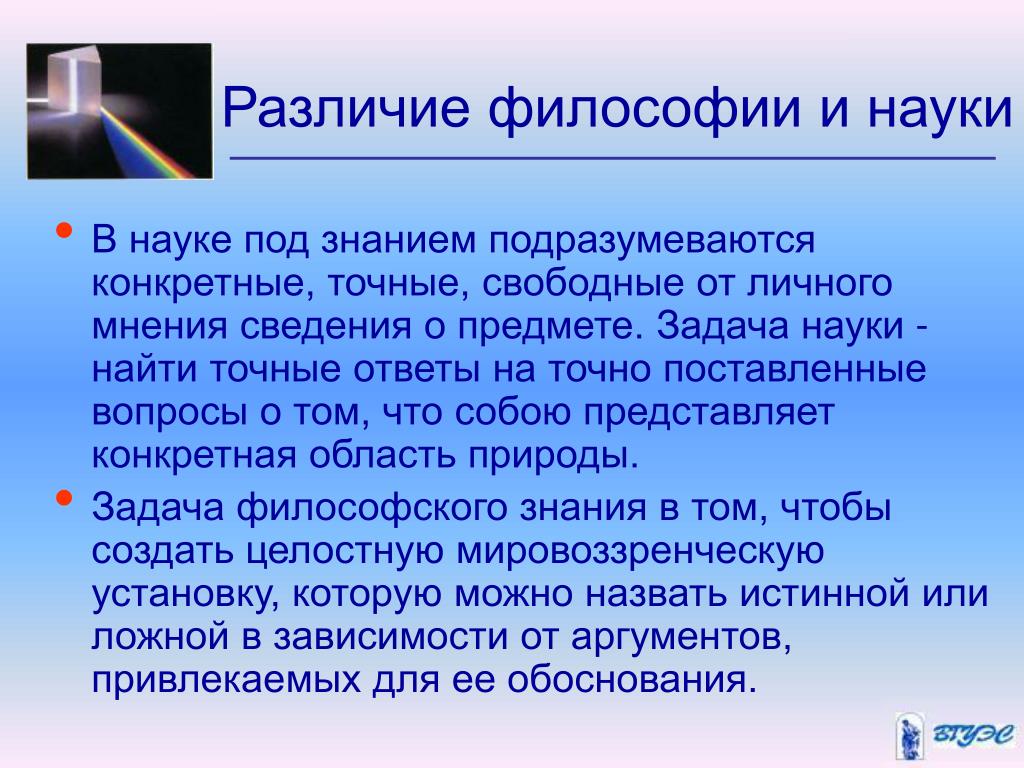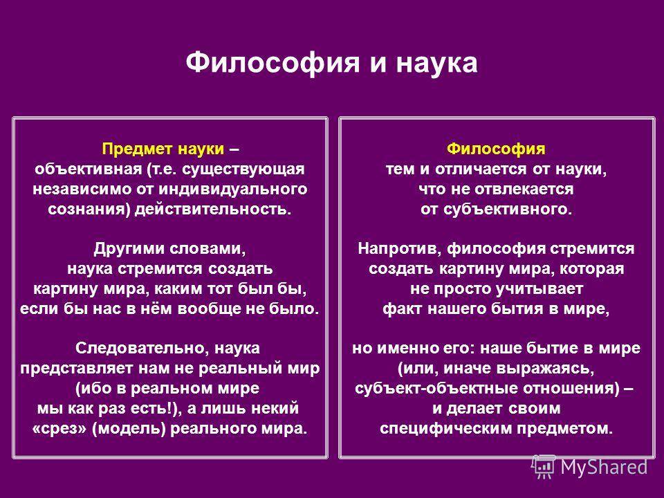Наука использует теоретические познавательные средства, она подвластна логике, но в жизни есть много субъективного, чувственного. В философии теоретическое и чувственное связано. Философская деятельность — это духовная жизнь, это поле поиска и обретение логических и экзистенциальных смыслов.