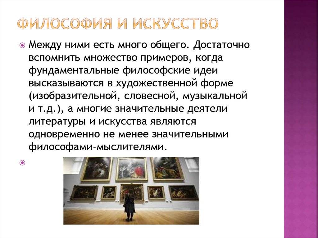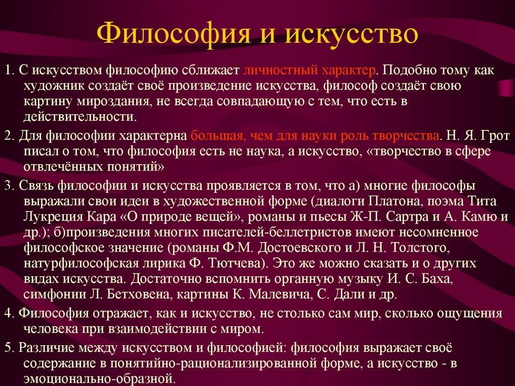 Философия тесно связана с искусством. Она характеризуется личностным характером, чувственно-эмоциональным отношением к миру. Искусство — это образное освоение мира, в нем превалирует индивидуальное, единичное. Оно отражает общее, типическое в конкретных, живых образах. Философское знание тоже является личностным. Философия является попыткой личностного познания сущего. Если научные истины в своем существе безлики, то в философии влияние личности отражается на результатах познания.