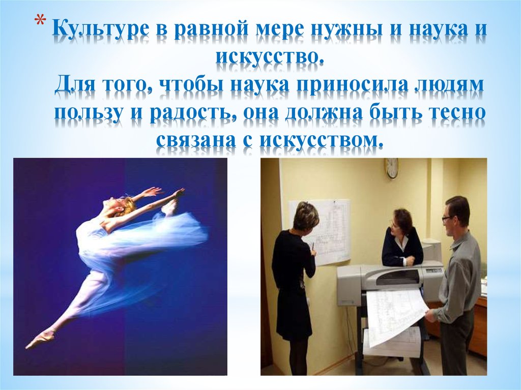 Поэтому искусство необходимо ставить наравне с наукой и уделять ему должное внимание и уважение. Ведь оно является неотъемлемой частью нашей культуры и помошником в осмыслении и проживании нашей жизнью