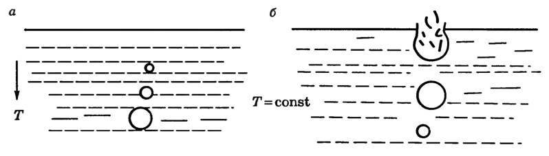 Механизм кипения: в жидкости всегда имеется растворенный газ, степень растворения которого понижается с ростом температуры. Кроме того, на стенках сосуда имеется адсорбированный газ. При нагревании жидкости снизу (рис. 4) газ начинает выделяться в виде пузырьков у стенок сосуда. В эти пузырьки происходит испарение жидкости. Поэтому в них, кроме воздуха, находится насыщенный пар, давление которого с ростом температуры быстро увеличивается, и пузырьки растут в объеме, а следовательно, увеличиваются действующие на них силы Архимеда. Когда выталкивающая сила станет больше силы тяжести пузырька, он начинает всплывать. Но пока жидкость не будет равномерно прогрета, по мере всплытия объем пузырька уменьшается (давление насыщенного пара уменьшается с понижением температуры) и, не достигнув свободной поверхности, пузырьки исчезают (захлопываются) (рис. 4, а), вот почему мы слышим характерный шум перед закипанием. Когда температура жидкости выравняется, объем пузырька при подъеме будет возрастать, так как давление насыщенного пара не изменяется, а внешнее давление на пузырек, представляющее собой сумму гидростатического давления жидкости, находящейся над пузырьком, и атмосферного, уменьшается. Пузырек достигает свободной поверхности жидкости, лопается, и насыщенный пар выходит наружу (рис. 4, б) — жидкость закипает. Давление насыщенного пара при этом в пузырьках практически равно внешнему давлению.