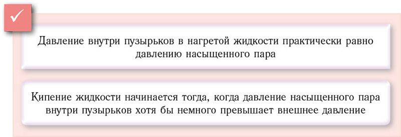 Если же воду поместить в герметически закрытый сосуд, во всех частях которого температура одинакова, то она не закипит при нагревании до температуры кипения, равной при нормальном атмосферном давлении 100 °С. Действительно, в этом случае над водой находится её насыщенный пар, давление которого равно давлению внутри пузырьков. А, как отмечалось ранее, кипение жидкости начинается тогда, когда давление насыщенного пара внутри пузырьков хотя бы немного превышает внешнее давление.